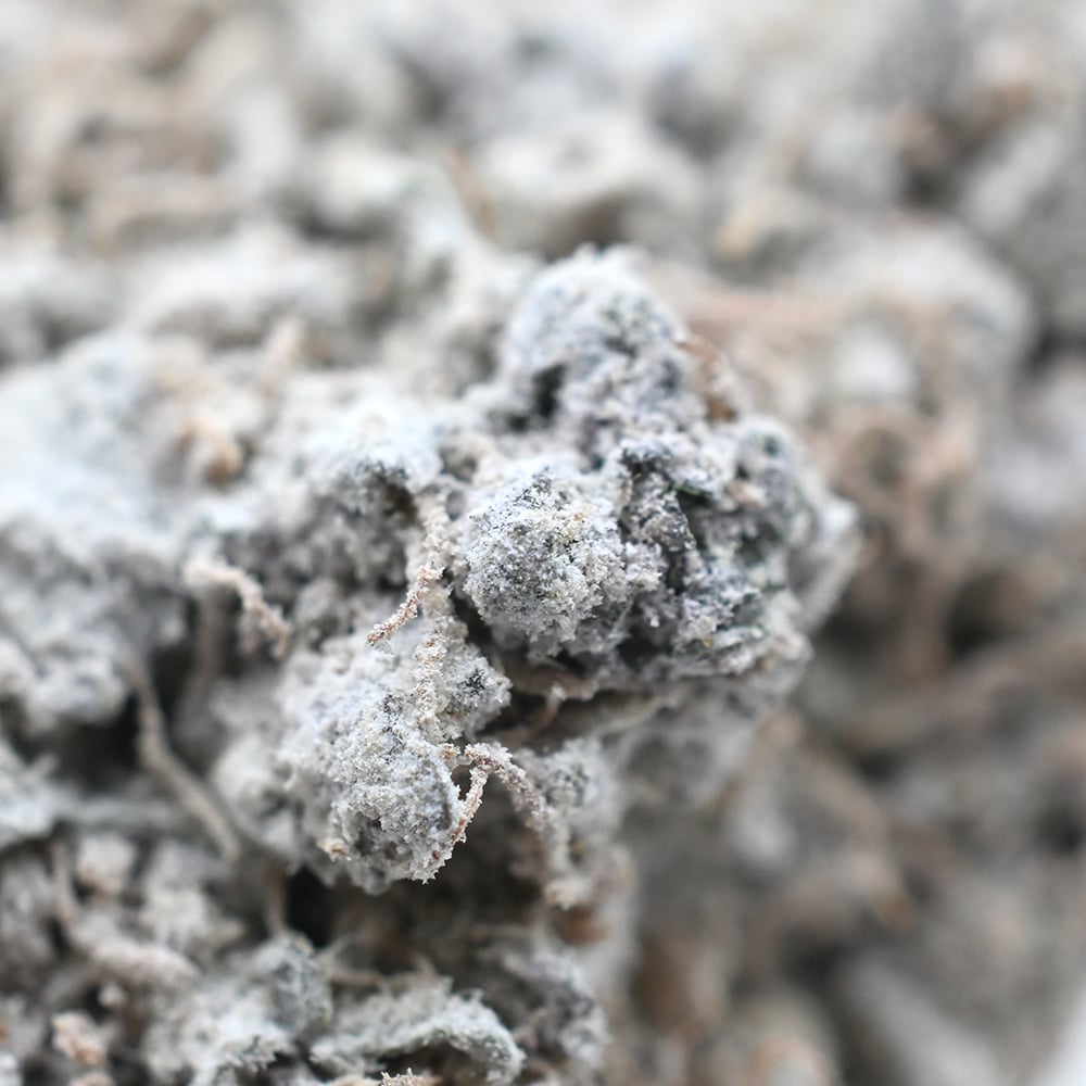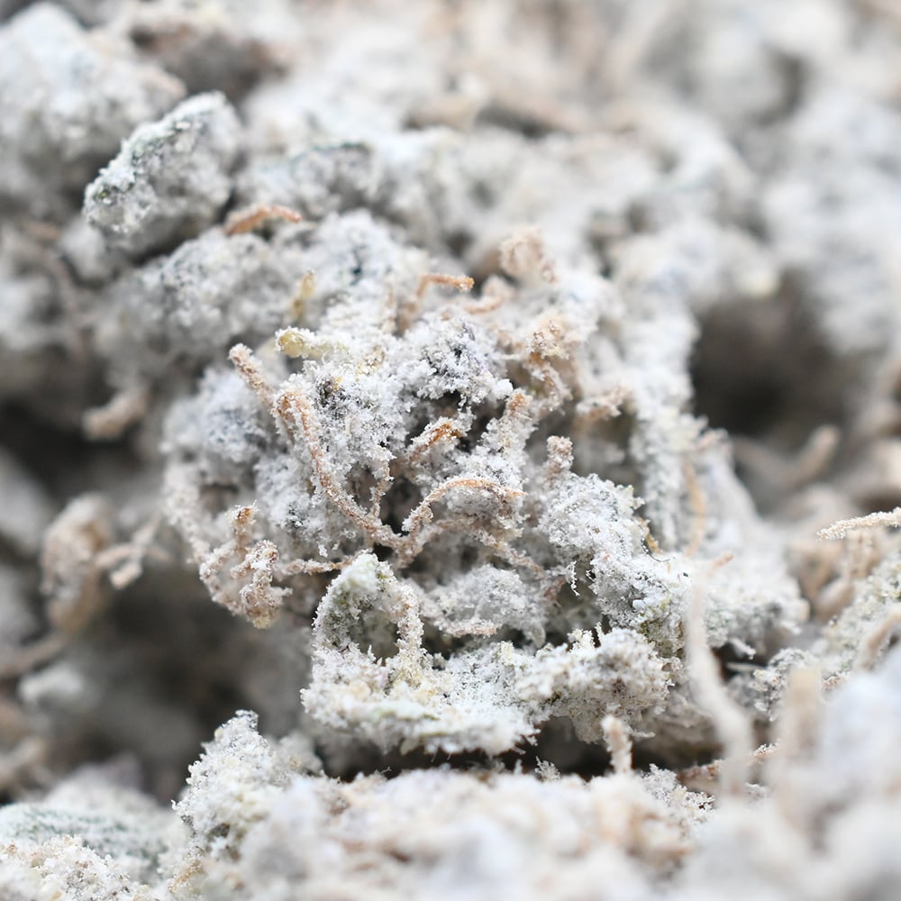 This bud has fluffy grape-shaped minty green nugs with dark green undertones, thin orange hairs and a coating of tiny white trichomes.