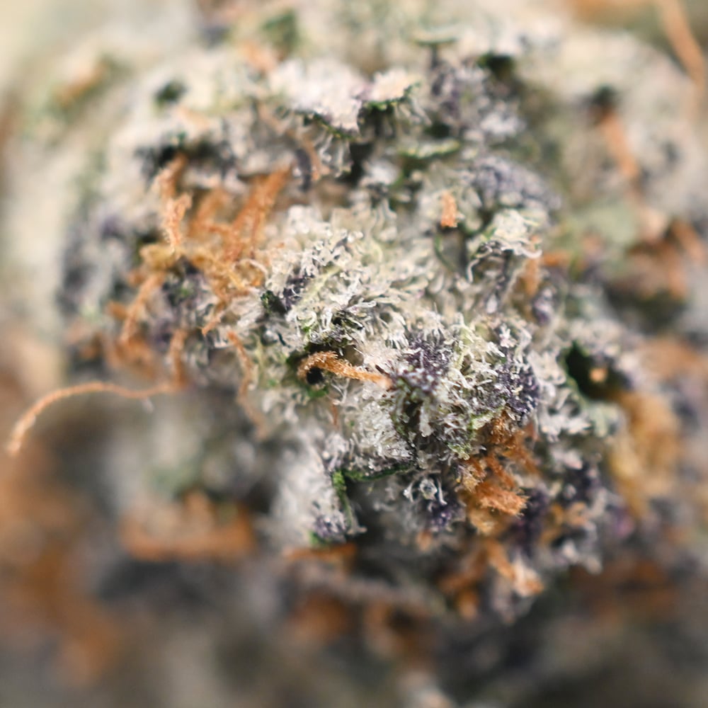 - Deep green, Fluffy buds with unique purple accents