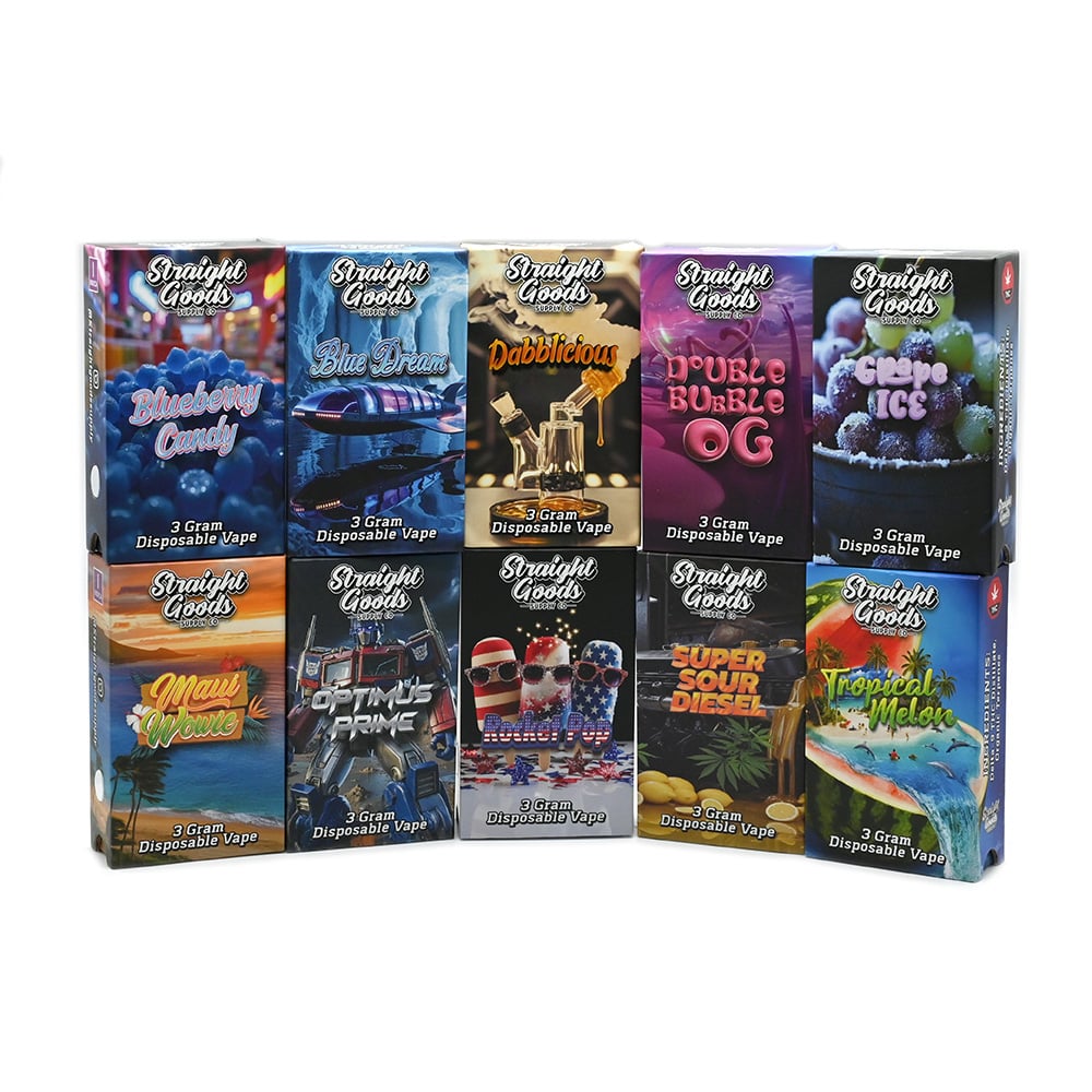 Straight Goods 3g disposable vape pens come in a wide variety of carefully curated flavors, each offering a unique flavor option. Every strain showcases the distinct flavor profiles of the cannabis plant, ensuring a calming effect or uplifting experience tailored to your needs. Each puff brings out the nuanced flavors of these strains, making your session a truly enjoyable experience.