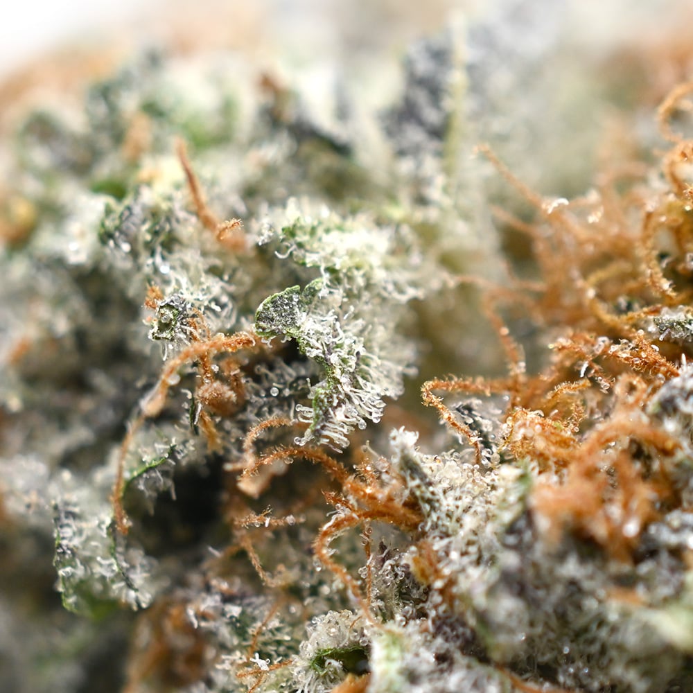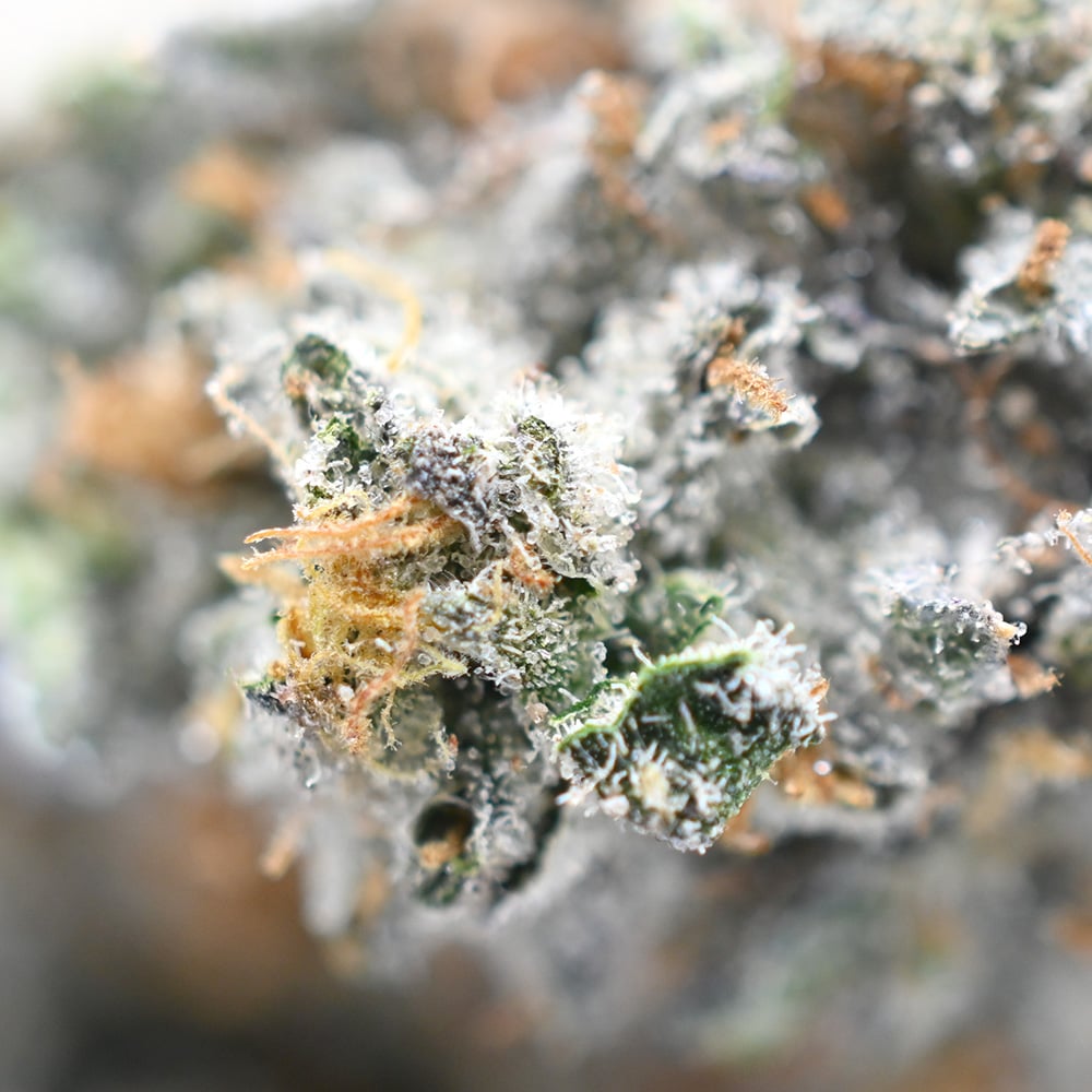 - Frosty green buds, coated in sticky trichomes