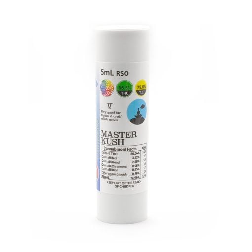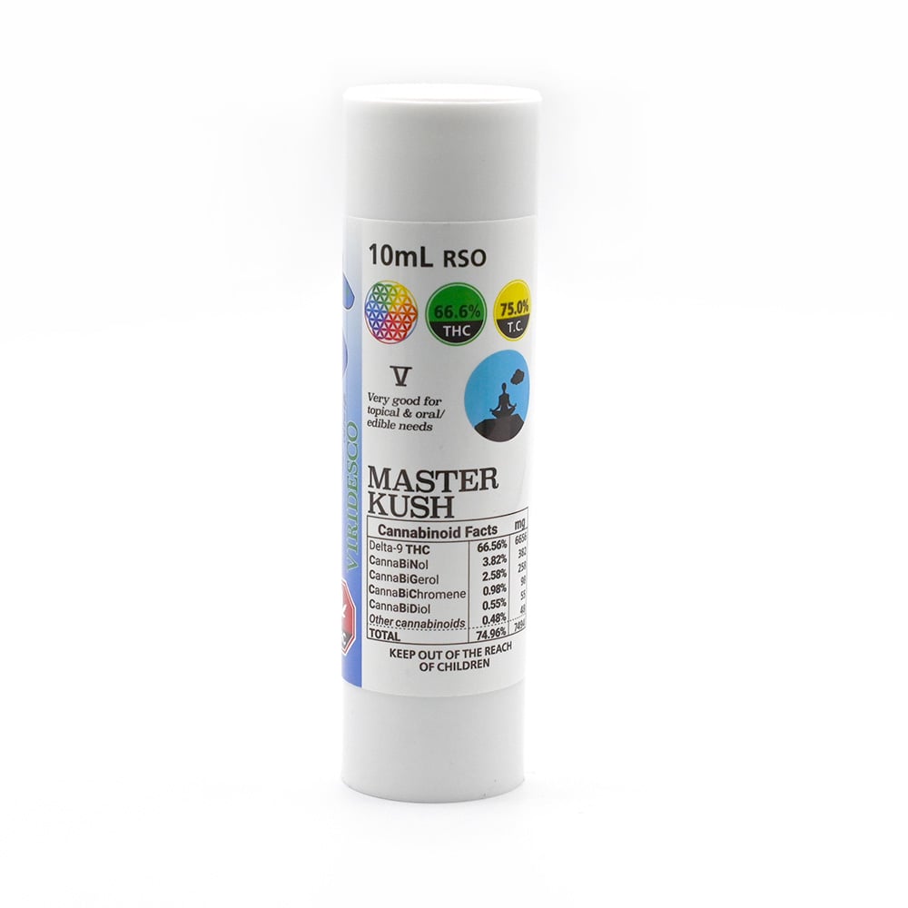 This high-end VIRIDESCO– Master Kush RSO has been independently tested at MB Labs to contain over 74.96% cannabinoids, including 66.56% THC!