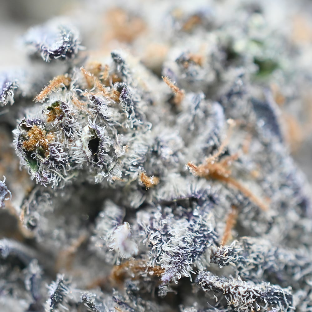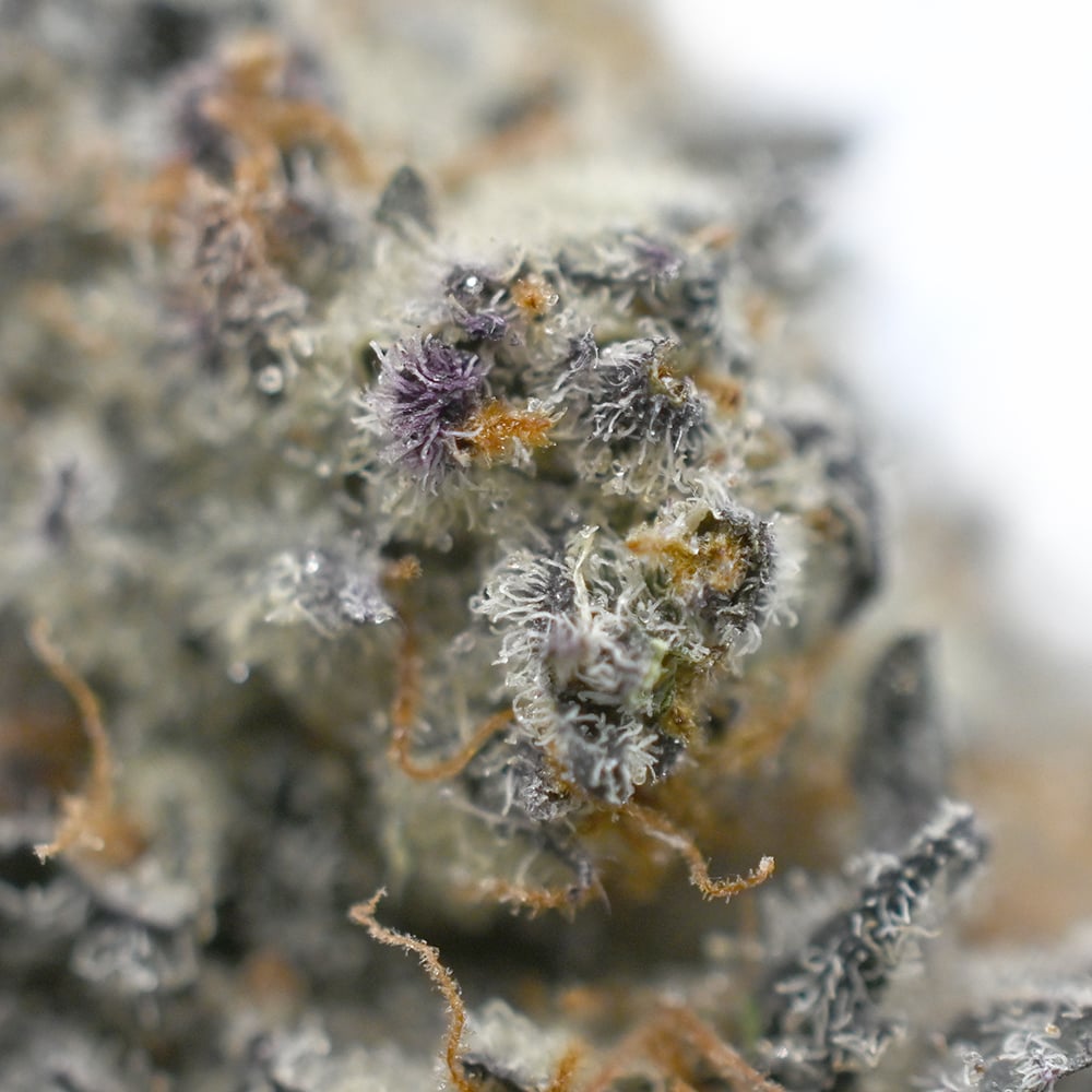 - Dense and sticky, featuring dark green nugs with subtle purple hues